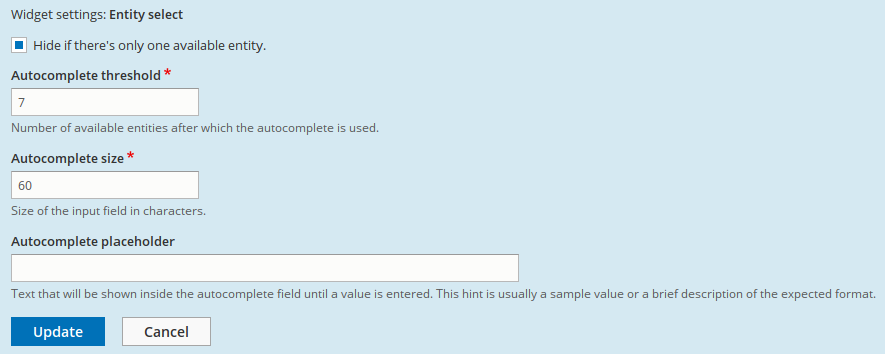 - Autocomplete threshold - Widget shows checkboxes if there are fewer than this many entities.