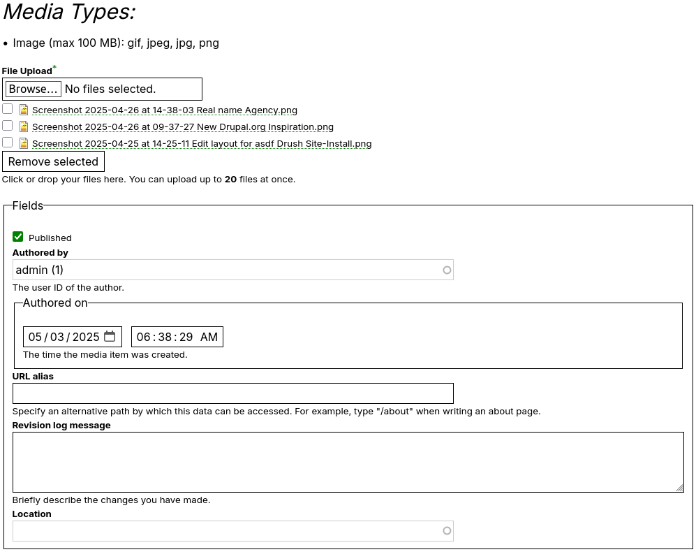 Core module Disabled Module page https://www.drupal.org/project/media_bulk_upload Module tags Enhancement Tags Media Import/Export Bulk upload media. Configure bulk upload types. Admin > Configure > Media > Bulk Upload Media. Upload media. Admin > Content > Media > Bulk Media Upload. See button on media content listing. Uploaded items will share the values in the edit form. IssuesProvide a way to add alt text when doing bulk uploadAllow to edit media fields for each uploaded item, inlineExpose a local action to bulk upload media itemsAdd support to create new taxonomy terms (entities) during bulk uploadRelated issuesQuestionsRelated modulesMedia LibraryMedia Library Bulk UploadResourcesArticlesChange recordsProject updatesTODO: Bulk import documentsTips